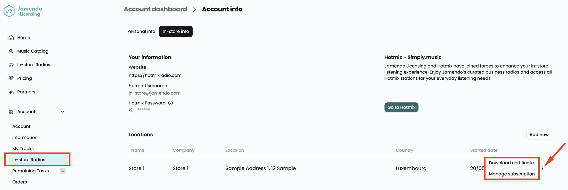 When you've finalized the check out process and successfully subscribed to the InStore Radio service, a License Certificate will be generated with your establishment's information. The certificate serves as verification that you are entitled to play music from Jamendo's In-Store radios within your establishment. The license certificate is valid for 12 months, allowing you to play the ten Jamendo In-Store radios for one year at your venue.