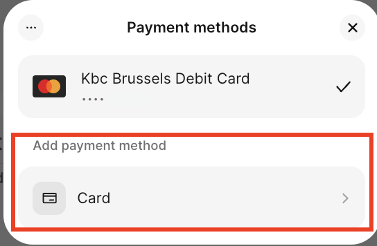 Note that your payment details are encrypted and you might receive a verification code on your phone number or email to verify your identity before managing your payment details. - Click on the saved card and select "Card" under the "Add payment method" section.