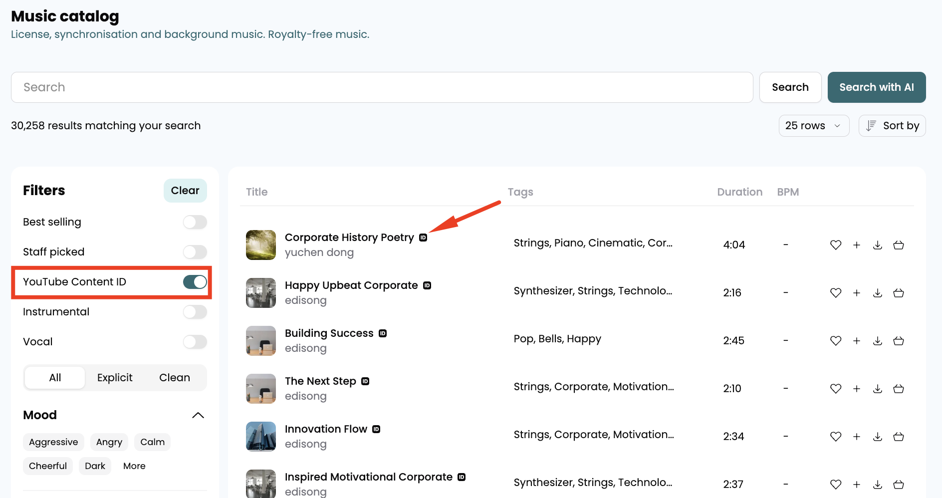 You can even filter tracks registered with Content ID in the filters section of the Music Catalog on the Jamendo Licensing website.